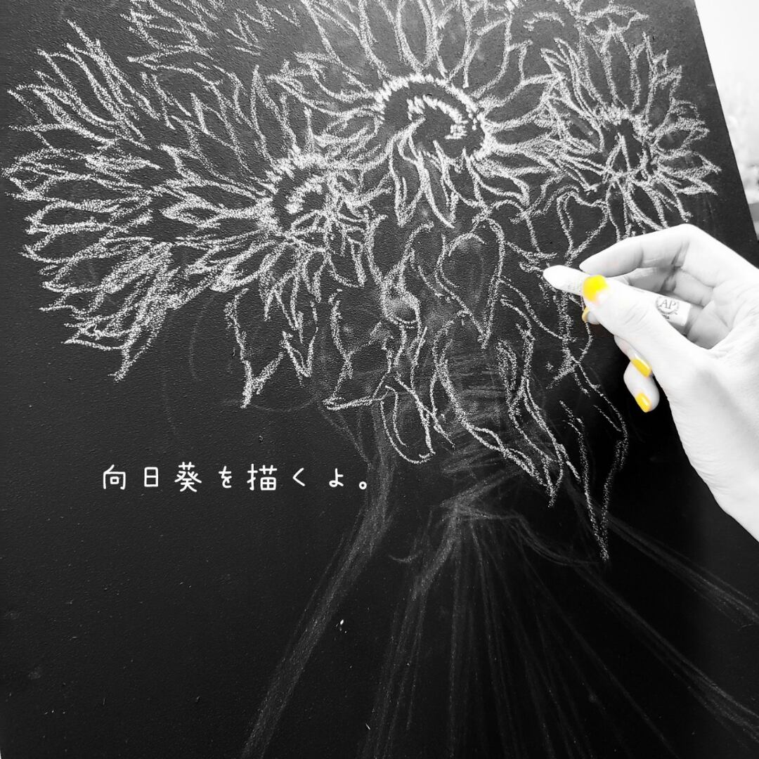 背面にはチョークアーティストrihoが描くチョークアートの向日葵が施されており、見た人の目を引くユニークなデザインが魅力です。